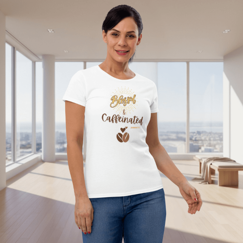 Front view of a woman wearing a white “Blessed & Caffeinated” t-shirt featuring gold and brown lettering with a coffee bean graphic. The bright modern indoor setting gives a clean, fresh, and uplifting feel.